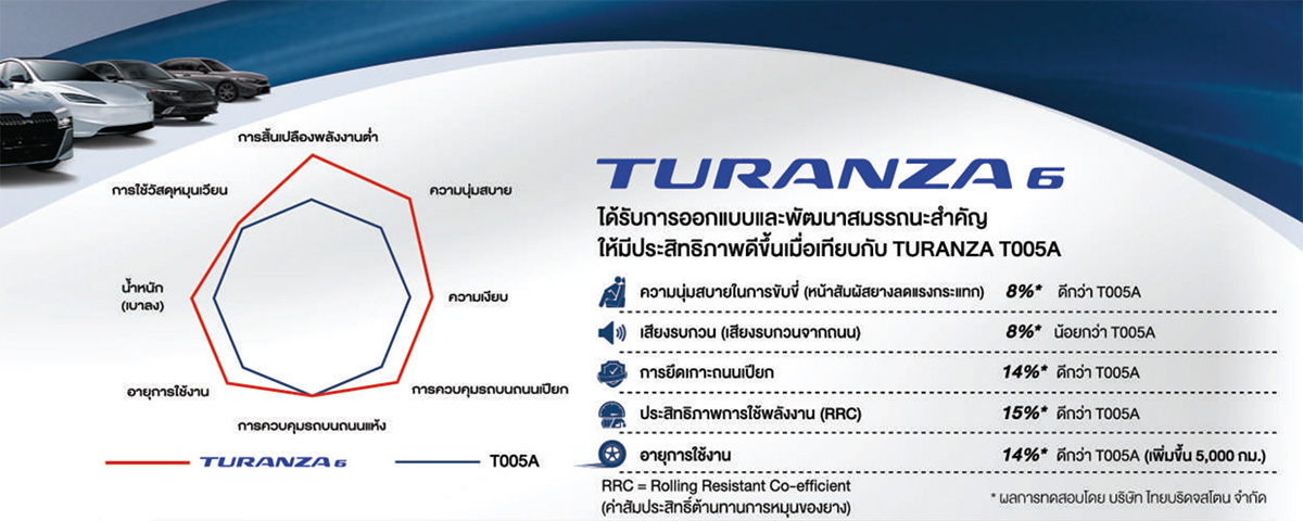ผลิตภัณฑ์ยาง BRIDGESTONE TURANZA 6 พัฒนาภายใต้ ENLITEN TECHNOLOGY สามารถเพิ่มประสิทธิภาพให้ดียึ่งขึ้นหลากหลายด้าน และยังลดผลกระทบต่อสิ่งแวดล้อม ให้การขับขี่ที่นุ่มสบาย พร้อมลดเสียงรบกวน พร้อมสมรรถนะในการยึดเกาะบนถนนเปียกได้รับการปรับปรุงให้ดีขึ้นด้วยเทคโนโลยี่ใหม่ เพิ่มประสิทธิภาพการใช้พลังงานได้ดีขึ้น