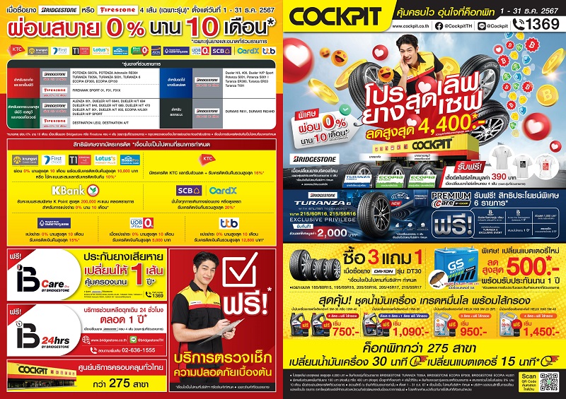 · Best tire deals and exclusive promotions: Savings up to 4,400 THB when replacing 4 tires of BRIDGESTONE in the following patterns and sizes, including BRIDGESTONE TURANZA T005A, BRIDGESTONE ECOPIA EP300 or BRIDGESTONE ECOPIA H/L001. The promotion is from December 1 to 31, 2024.