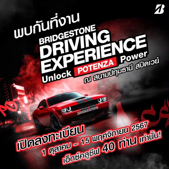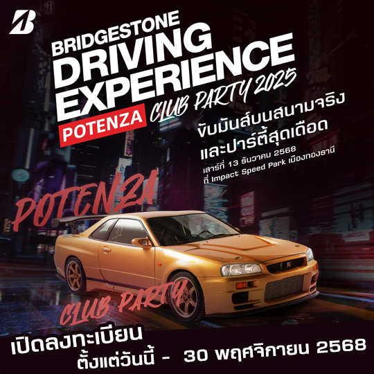 2025 Bridgestone Driving Experience! ในธีม “POTENZA Club Party”! มันส์กับประสบการณ์ขับจริงบนสนามแข่ง และปาร์ตี้สุดเดือด พร้อม Meet & Greet คุณเบียร์ ใบหยก และแก๊งร่างทอง Top Secret Thailand พร้อมทั้งทีมงาน Street Doc ครบทีม!! ร่วมลุ้น Lucky Draw และของรางวัลมากมาย!