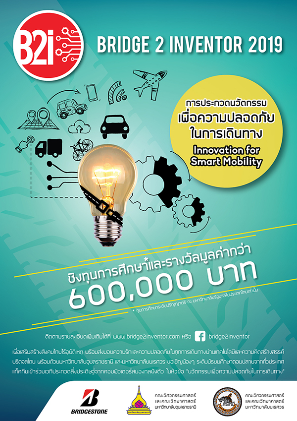บริษัท ไทยบริดจสโตน จํากัด ผู้นำด้านการผลิตยางรถยนต์อันดับหนึ่งในประเทศไทย จุดประกายความคิดให้กับเยาวชนนักประดิษฐ์รุ่นใหม่สานต่อโครงการ Bridge 2 Inventor 2019 ชวนน้องๆ ระดับมัธยมศึกษาตอนปลายทั่วประเทศแท๊คทีมร่วมเวทีประกวดสิ่งประดิษฐ์จากคอมพิวเตอร์สมองกล ในหัวข้อ “นวัตกรรมเพื่อความปลอดภัยในการเดินทาง” “Innovation for Smart Mobility” เพื่อเสริมสร้างสังคมไทยไร้อุบัติเหตุ พร้อมส่งมอบความรักและความปลอดภัยในทุกการเดินทางผ่านเทคโนโลยีและความคิดสร้างสรรค์ พร้อมชิงรางวัลทุนการศึกษาและรางวัลมูลค่ากว่า 600,000 บาท โดยมีมหาวิทยาลัยอุบลราชธานี และมหาวิทยาลัยนเรศวร ร่วมสนับสนุนการแข่งขันฯ