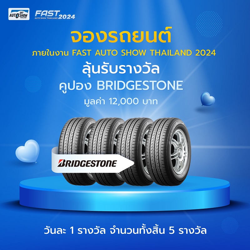 [กรุงเทพฯ] (4 กรกฎาคม 2567) –บริดจสโตนเดินหน้าสนับสนุนงาน “FAST AUTO SHOW THAILAND 2024” ภายใต้คอนเซปต์ “รถใหม่โปรดี รถไฟฟ้ามีให้ลอง รถมือสองมีรับประกัน” เพื่อส่งเสริมและกระตุ้นตลาดรถยนต์ในประเทศไทยให้คึกคัก พร้อมรองรับกับการเติบโตของยานยนต์ไฟฟ้า รวมถึงขับเคลื่อนเศรษฐกิจในภาคอุตสาหกรรมยานยนต์ให้เติบโตอย่างต่อเนื่อง โดยลูกค้าที่จองรถภายในงาน