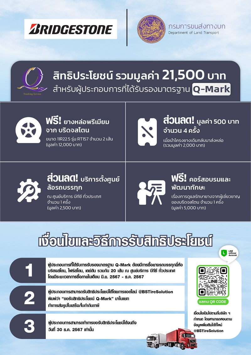 บริดจสโตนสานต่อความร่วมมือกับกรมการขนส่งทางบก มอบสิทธิประโยชน์ด้านยางหล่อพรีเมียม สำหรับผู้ประกอบการที่ได้มาตรฐาน Q Mark ทั่วประเทศ ในปี 2567