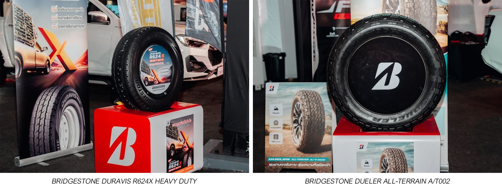 ในโอกาสนี้บริดจสโตนได้ร่วมออกบูธแนะนำผลิตภัณฑ์ “BRIDGESTONE DURAVIS R624X HEAVY DUTY” บรรทุกหนักเอ็กซ์ตร้า ทนทานเหนือโลก ความทนทานที่พัฒนาไปอีกขั้นเพื่อรถกระบะเชิงพาณิชย์และรถบรรทุกขนาดกลาง ออกแบบให้บรรทุกได้หนักขึ้น พร้อมอายุการใช้งานที่ยาวนาน และ “BRIDGESTONE DUELER ALL-TERRAIN A/T002” ลุยผ่าน