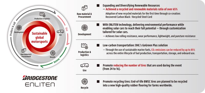 ด้วยการนำ ENLITEN ซึ่งเป็นเทคโนโลยีหลักของบริดจสโตนในการออกแบบผลิตภัณฑ์ยางรถยนต์มาใช้บริษัทจึงสามารถลดผลกระทบต่อสิ่งแวดล้อม และยังตอบโจทย์สมรรถนะของรถยนต์พลังงานแสงอาทิตย์ได้ดี ไม่ว่าจะเป็นแรงต้านทานการหมุนต่ำ น้ำหนักเบา และยืดอายุการใช้งานได้ยาวนาน นอกจากนี้ยังช่วยเพิ่มสมรรถนะให้รถยนต์พลังงานแสงอาทิตย์ภายใต้สภาพการแข่งขันสุดท้าทาย และช่วยให้การขับขี่ปลอดภัยในระยะทางที่ไกลกว่า 3,000 กม.