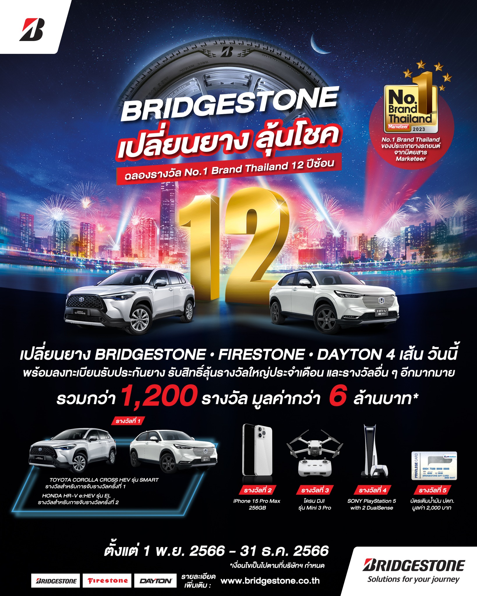 ครั้งที่ 1 ตั้งแต่วันที่ 1 พฤศจิกายน 2566 หรือวันที่ได้รับอนุญาตจากเจ้าพนักงานผู้ออกใบอนุญาต (กรณีเป็นการอนุญาตหลังวันที่ 1 พฤศจิยายน 2566) หมดเขตวันที่ 30 พฤศจิกายน 2566 เวลา 24.00น. จับรางวัลวันที่ 6 ธันวาคม 2566 เวลา 13.30 น. ประกาศผลผู้โชคดีผ่านทาง BRIDGESTONE FACEBOOK FANPAGE และโทรแจ้งแก่ลูกค้าผู้โชคดีทุกคน ภายในวันที่ 31 ธันวาคม 2566