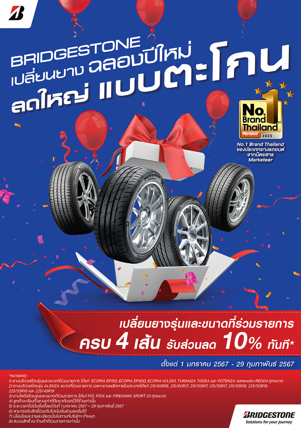 2) ยางบริดจสโตนรุ่น ALENZA ขนาดที่ร่วมรายการ เฉพาะยางผลิตภายในประเทศได้แก่ 215/60R16, 215/60R17, 215/50R17, 215/55R17, 215/55R18, 225/50R18, 225/55R18 และ 225/45R19