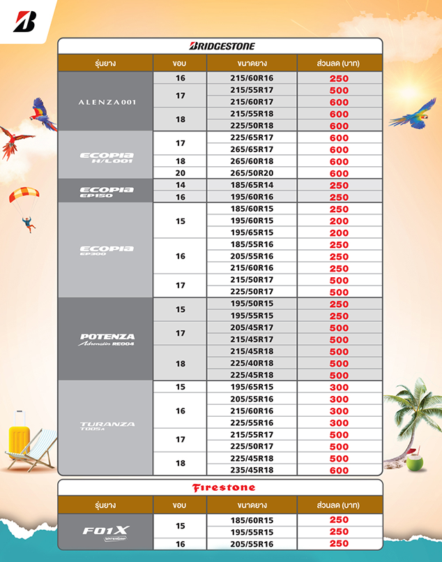 2) ยางไฟร์สโตนรุ่นและขนาดที่ร่วมรายการ ได้แก่ F01X