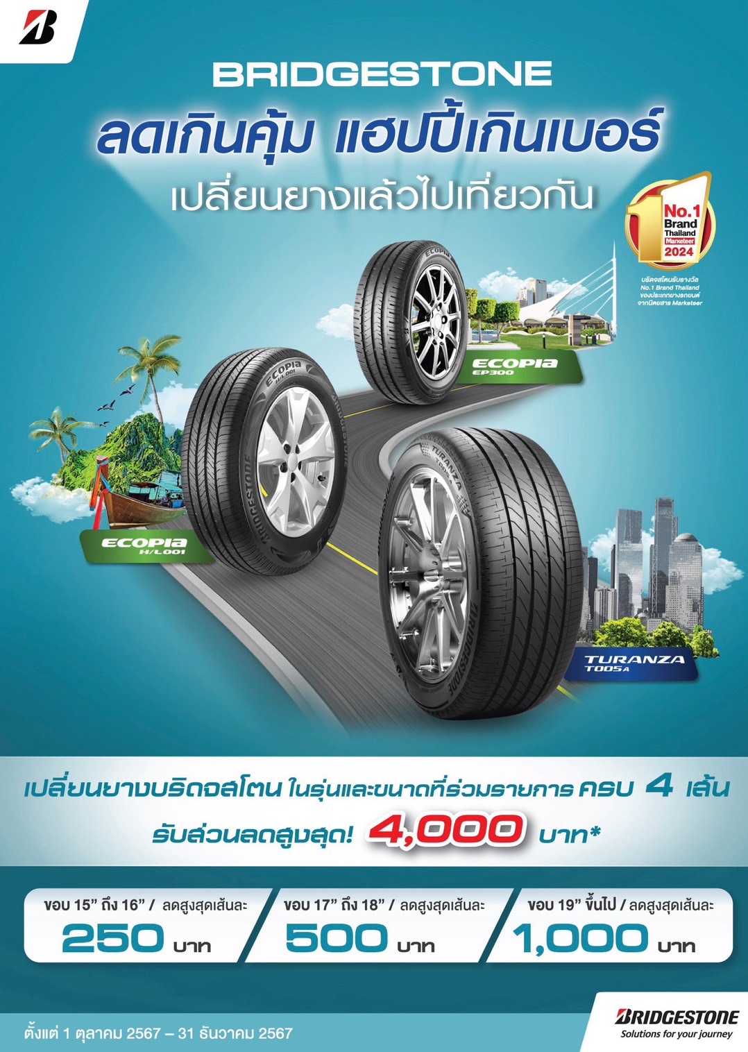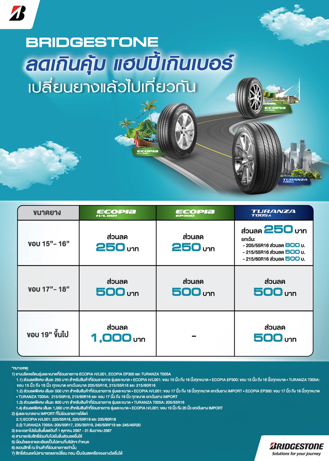 1) ยางบริดจสโตนรุ่นและขนาดที่ร่วมรายการ ECOPIA H/L001, ECOPIA EP300 และ TURANZA T005A