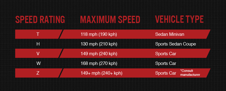 อัตราดัชนีสัญลักษณ์ความเร็วต่อไปนี้เป็นสิ่งที่คุณจะพบสำหรับรถยนต์ทั่วไป เริ่มต้นด้วยความเร็วสูงสุดที่ 190 กิโลเมตรต่อชั่วโมง และจะเพิ่มขึ้นเรื่อย ๆ การระบุด้วยตัวอักษรยางรถยนต์ คือการจัดอันดับอัตราดัชนีสัญลักษณ์ความเร็วแต่ละประเภทจะสอดคล้องความเร็วที่ระบุ