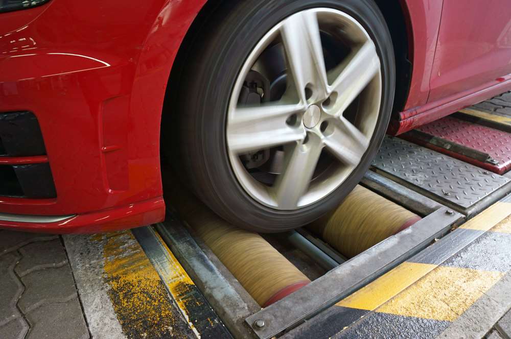 4. ทดสอบระบบเบรก เพื่อตรวจประสิทธิภาพการเบรกว่ายังสามารถทำงานได้ดีอยู่หรือไม่ โดยทำการทดสอบบนลูกกลิ้งดังรูปด้านล่างนี้ เพื่อวัดประสิทธิภาพการเบรกของล้อแต่ละข้าง โดยค่อยๆเหยียบเบรกไปเรื่อยๆ จนถึงแรงเบรกสูงสุด ซึ่งผลที่อยู่ในเกณฑ์ที่ผ่านได้มีดังนี้