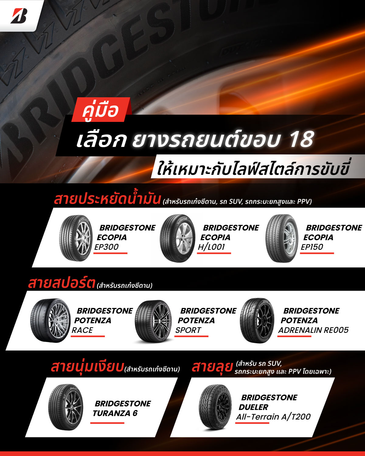 ในบทความนี้ บริดจสโตน จะพาคนรักรถมาทำความเข้าใจ ลักษณะการใช้งานของยางรถยนต์ขอบ 18 เพื่อช่วยให้คุณเลือกยางที่เหมาะกับสไตล์การขับขี่ได้อย่างลงตัว