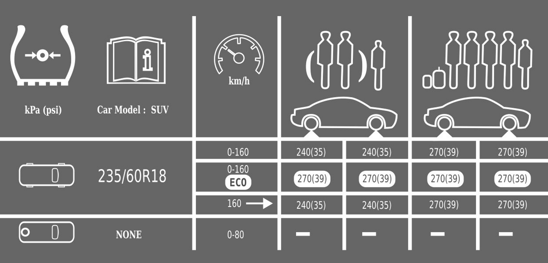 โดยในบางรุ่นของรถยนต์จะมีการเเนะนำเพิ่มเติมอีกว่าควรเติมลมยางรถยนต์มากขึ้นกว่าปกติเท่าใดเมื่อต้องมีการบรรทุกน้ำหนักที่เยอะขึ้นมากกว่าเดิม อย่างเช่นในรูปตัวอย่างด้านบนของรถ SUV ถ้าหากมีการบรรทุกคนประมาณ 2-3 คน การเติมลมยางรถยนต์ที่เหมาะสมคืออยู่ที่ 35 PSI ทั้งล้อหน้าเเละล้อหลัง เเต่ถ้าหากมีการบรรทุกคนมากขึ้นถึง 5 คนรวมถึงมีสัมภาระเเละกระเป๋าอีก 1-2 ใบ ก็ควรทำการเติมลมยางรถยนต์เพิ่มขึ้นไปอีกเป็น 39 PSI ทั้งล้อหน้าเเละล้อหลัง