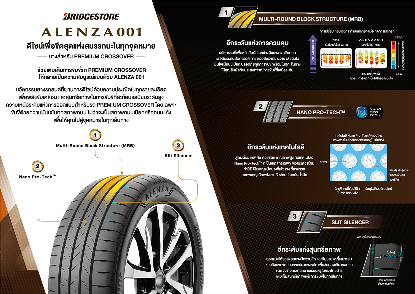 ยางสำหรับ PREMIUM CROSSOVER ช่วยเติมเต็มการขับขี่รถ PREMIUM CROSSOVER ให้กลายเป็นความสมบูรณ์แบบด้วย ALENZA 001
