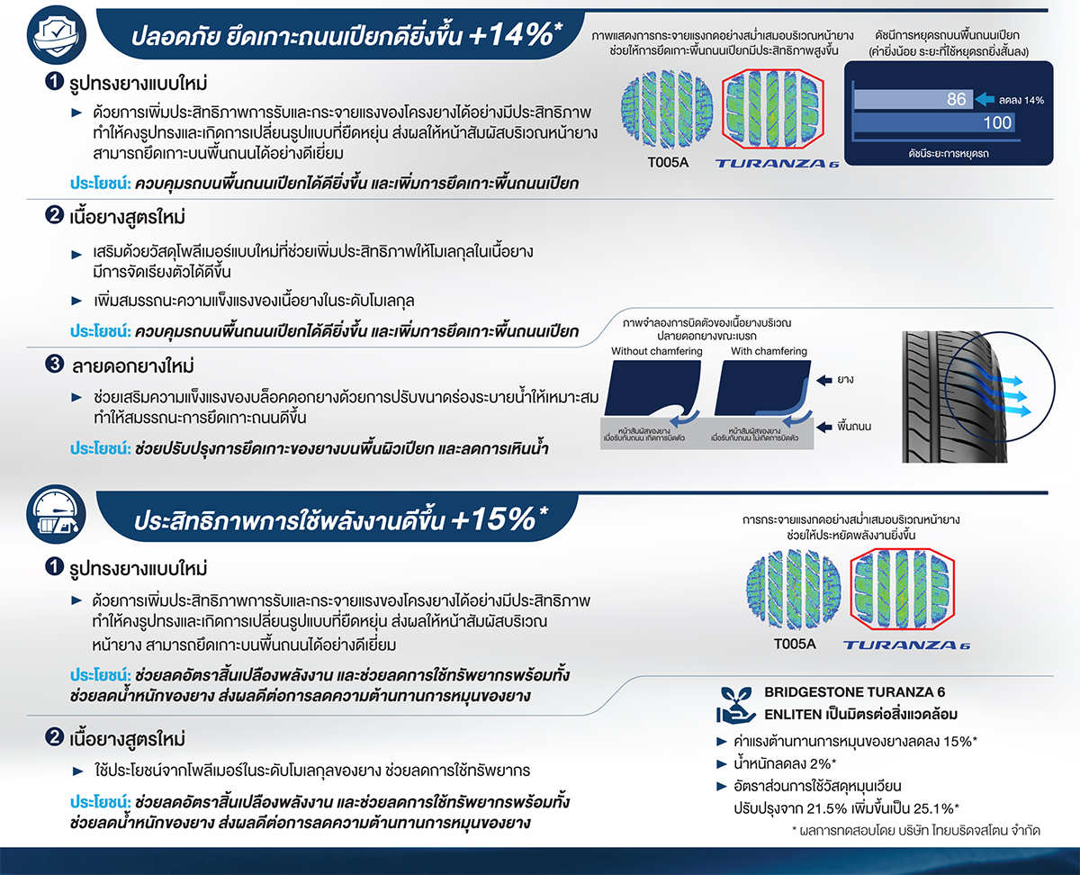 ผลิตภัณฑ์ยาง BRIDGESTONE TURANZA 6 พัฒนาภายใต้ ENLITEN TECHNOLOGY สามารถเพิ่มประสิทธิภาพให้ดียึ่งขึ้นหลากหลายด้าน และยังลดผลกระทบต่อสิ่งแวดล้อม ให้การขับขี่ที่นุ่มสบาย พร้อมลดเสียงรบกวน พร้อมสมรรถนะในการยึดเกาะบนถนนเปียกได้รับการปรับปรุงให้ดีขึ้นด้วยเทคโนโลยี่ใหม่ เพิ่มประสิทธิภาพการใช้พลังงานได้ดีขึ้น