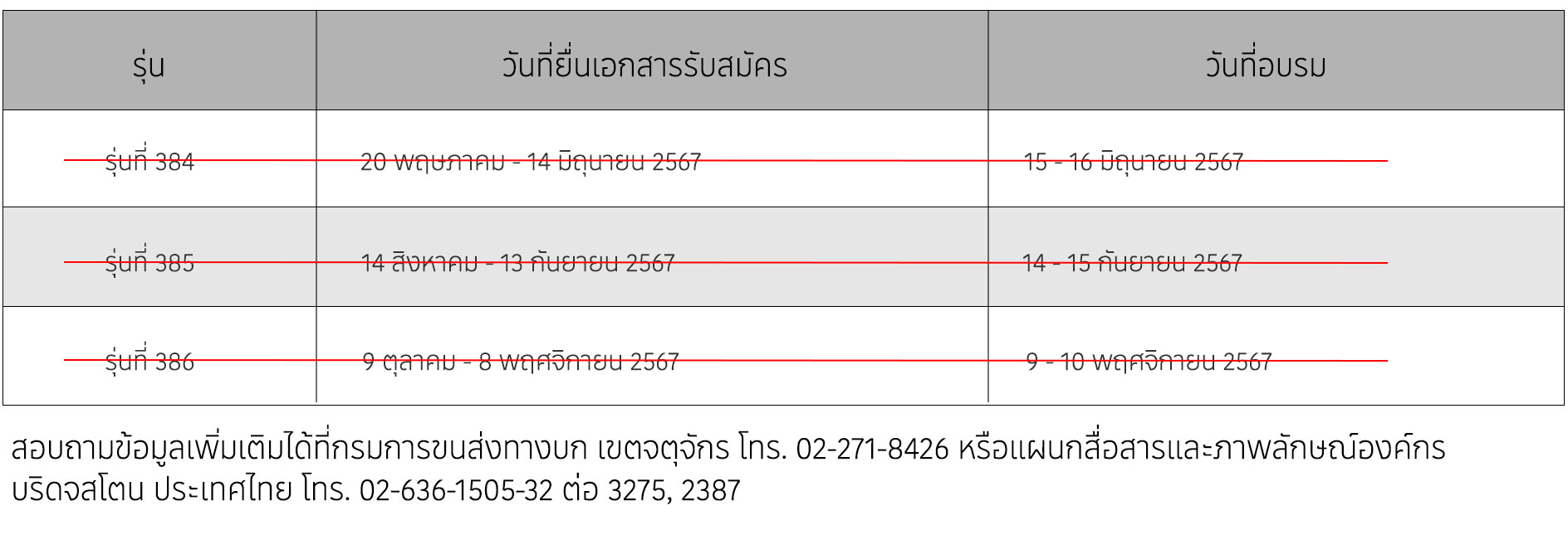 · ในปีพ.ศ. 2567 เปิดอบรมรวมทั้งสิ้น 3 รอบ 3 รุ่น ในวันเสาร์และวันอาทิตย์ ณ กรมการขนส่งทางบก เขตจตุจักร ดังนี้